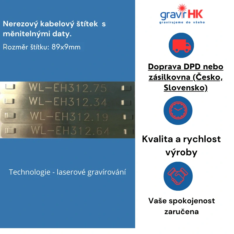 Nerezový kabelový štítek 89x9mm s laserovým gravírováním.Skladem 2000 ks48,4 Kč/ ks40 Kč bez DPH