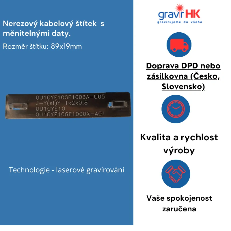 Nerezový kabelový štítek 89x19 mm s laserovým gravírováním.Skladem 2000 ks54,5 Kč/ ks45 Kč bez DPH
