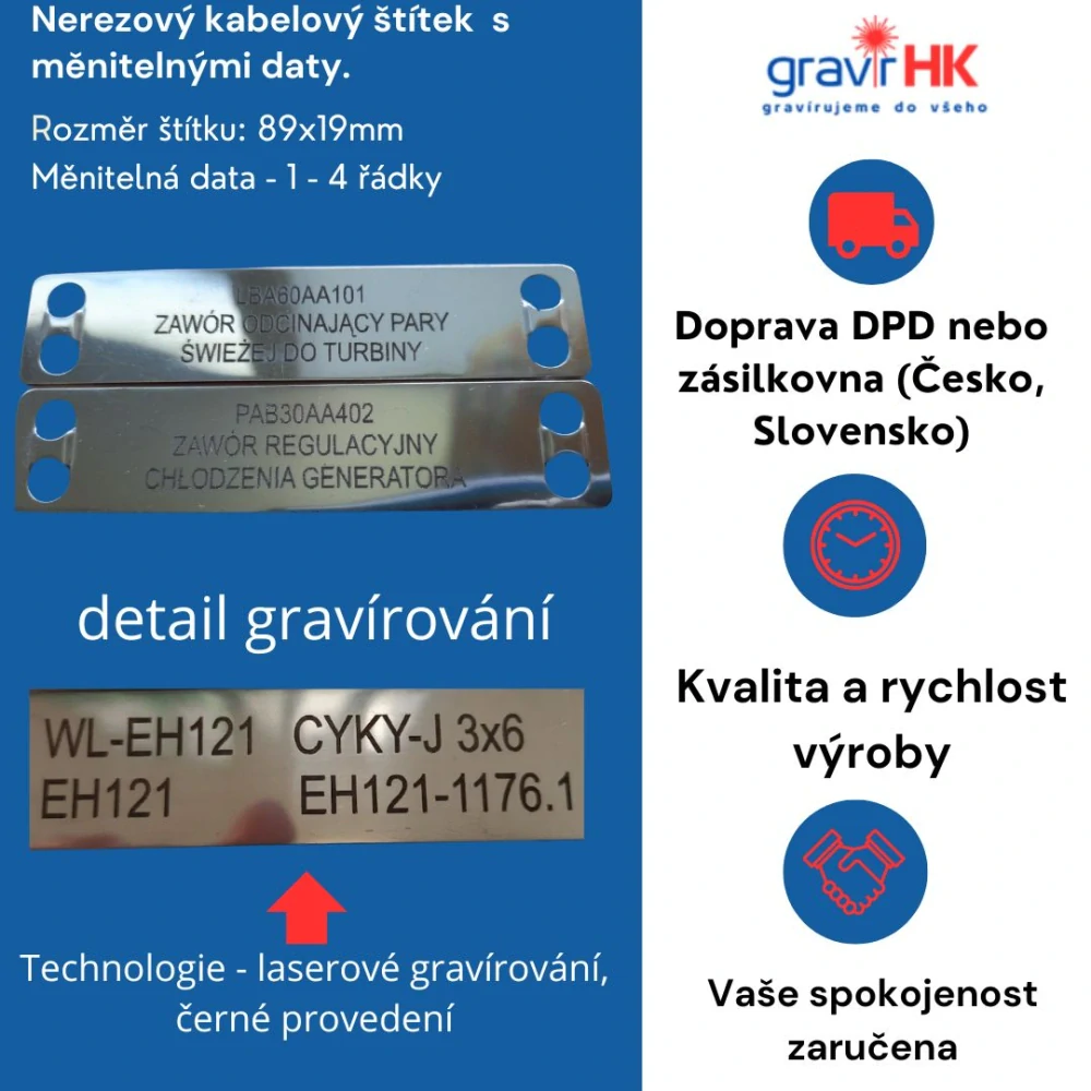 Nerezový kabelový štítek 89x19 mm laserovým gravírováním - černé provedení